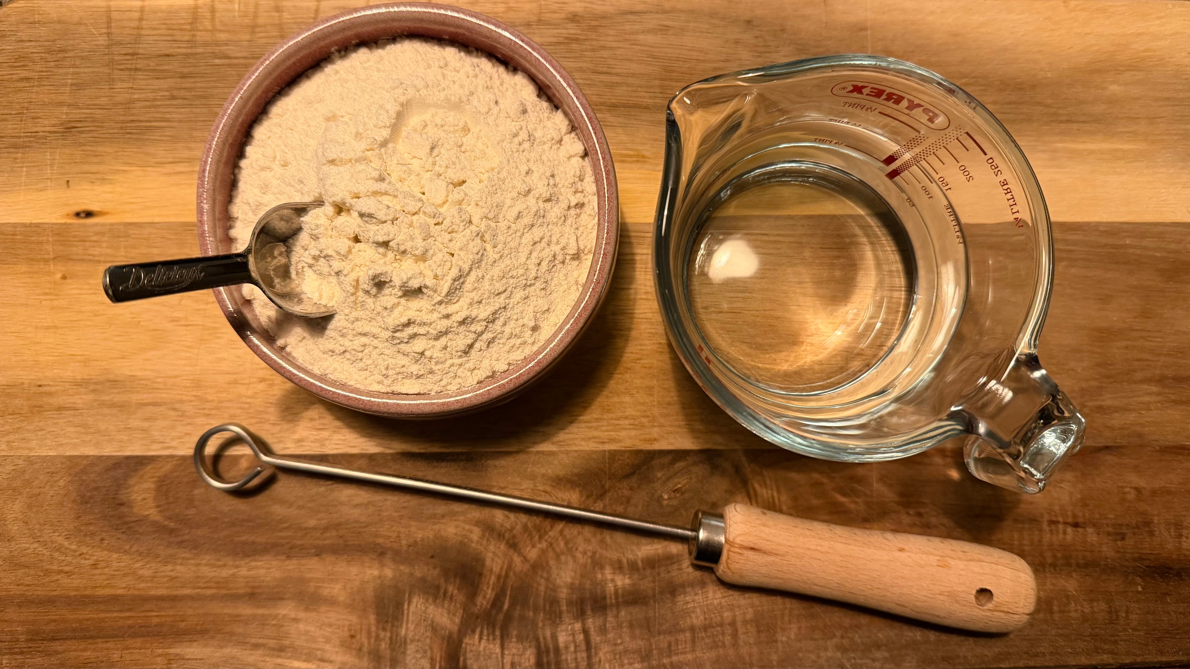 The stainless steel rod moves easily through water, flour and sourdough starter, blending everything into a soft, airy mix.
